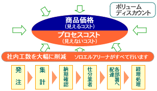 「ソロエルアリーナ」は、購買の直接コストと、業務にさかれる手間と時間人員という間接コストとをダブルで削減できる画期的なシステムをご提供します。
